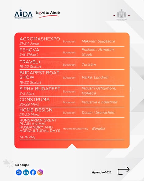 Zbuloni panairet më të rëndësishme ndërkombëtare që do të zhvillohen në Hungari gjatë vitit 2026. Një mundësi ideale për biznese, investitorë dhe profesionistë për të krijuar lidhje të reja, për të promovuar potencialin shqiptar dhe për të zgjeruar bashkëpunimet me partnerë ndërkombëtarë.